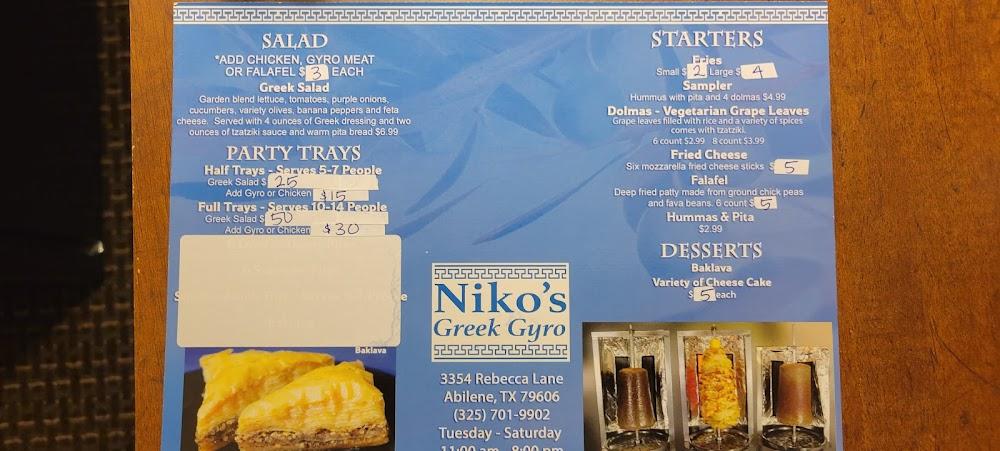 Welcome to Nikos Greek Gyros, your local haven for authentic Greek cuisine in Abilene, TX! Situated at 3354 Rebecca Ln, we specialize in mouthwatering gyros, featuring tender meats and vibrant flavors, perfect for every palate. Enjoy a cozy dine-in experience, or take advantage of our convenient takeout and delivery options. With affordable prices ranging from $10 to $20, our welcoming atmosphere is perfect for families, offering high chairs and easy wheelchair access. Our friendly staff is ready to serve you lunch or dinner, with the option to make reservations. Treat yourself to the deliciousness of Nikos Greek Gyros today!